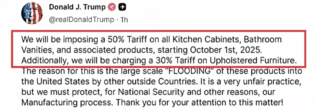 特朗普强调,为保护美国本土产业,将对进口的厨房橱柜、浴室洗手台及相关建材、家具、重型卡车等产品分别加征不同比例关税,